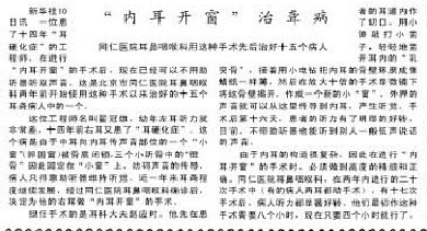 “一位患了十四年‘耳硬化症’的工程师,在进行‘内耳开窗’的手术后,现在已经可以不用助听器听取声音。这是北京市同仁医院耳鼻咽喉科两年前开始使用这种手术以来治好的十五个耳聋病人中的一个……”