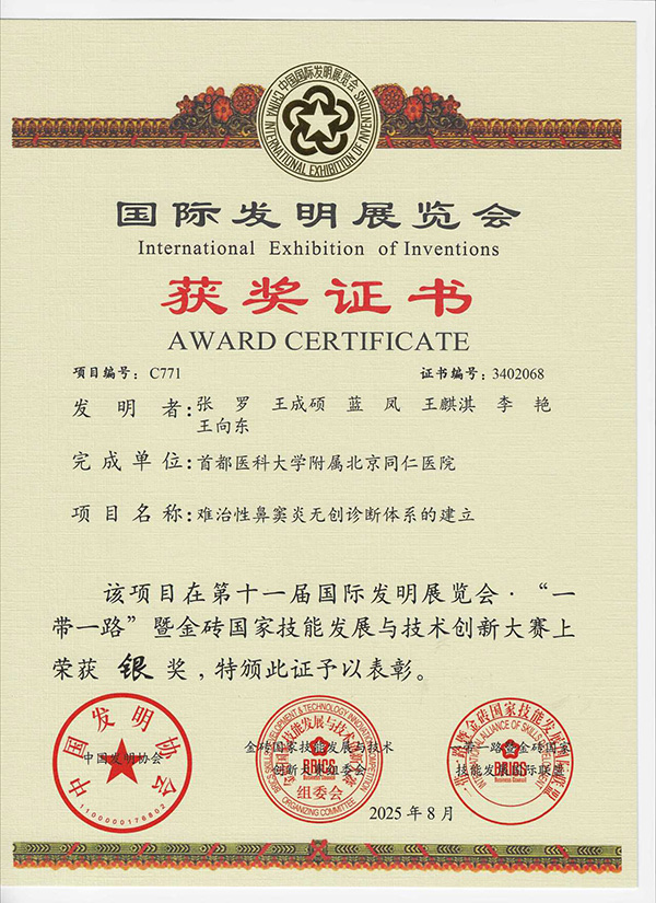 难治性鼻窦炎无创诊断体系的建立 | 张罗、王成硕、蓝凤、王麒淇、李艳、王向东 | 银奖 |