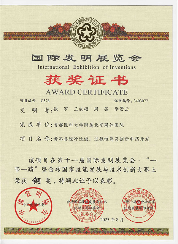 黄芩鼻腔冲洗液:过敏性鼻炎创新中药开发 | 张罗、王成硕、周芸、李景云 | 铜奖 |
